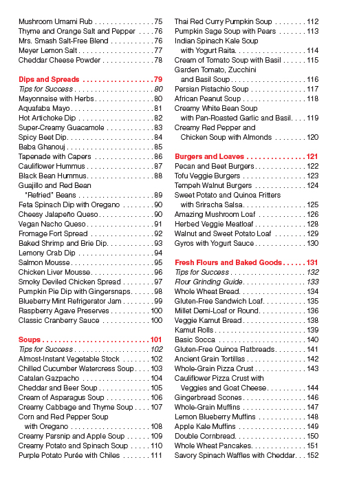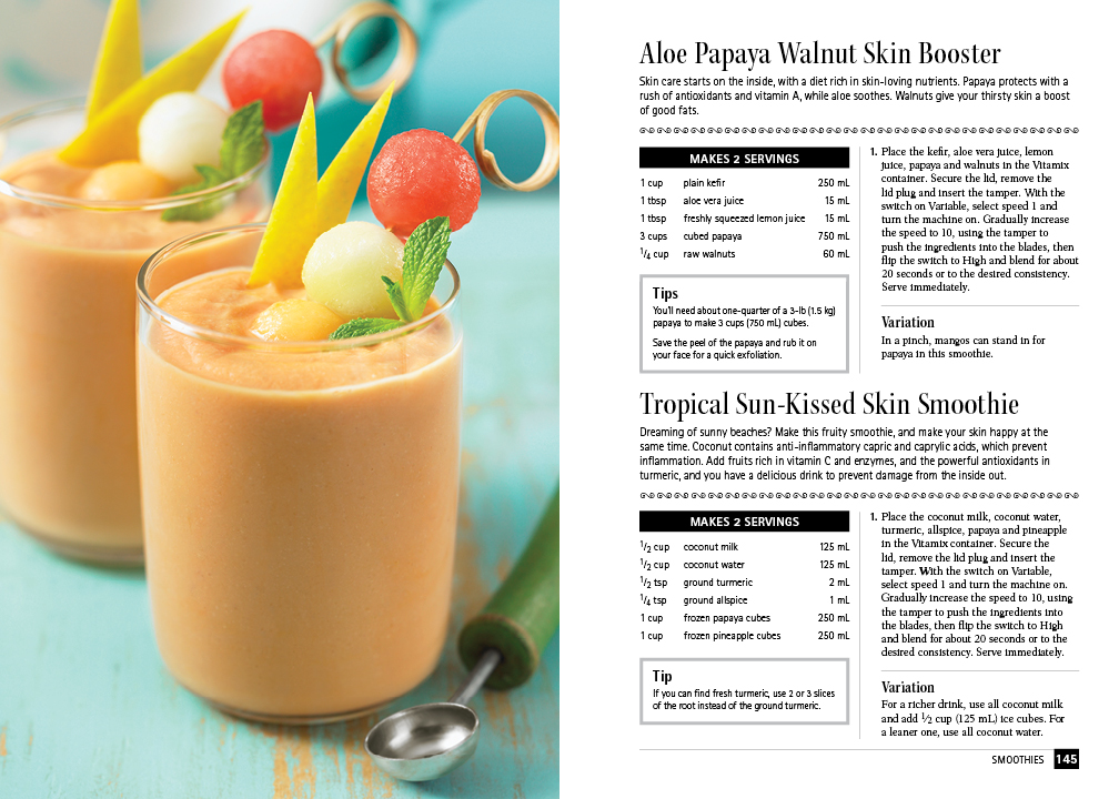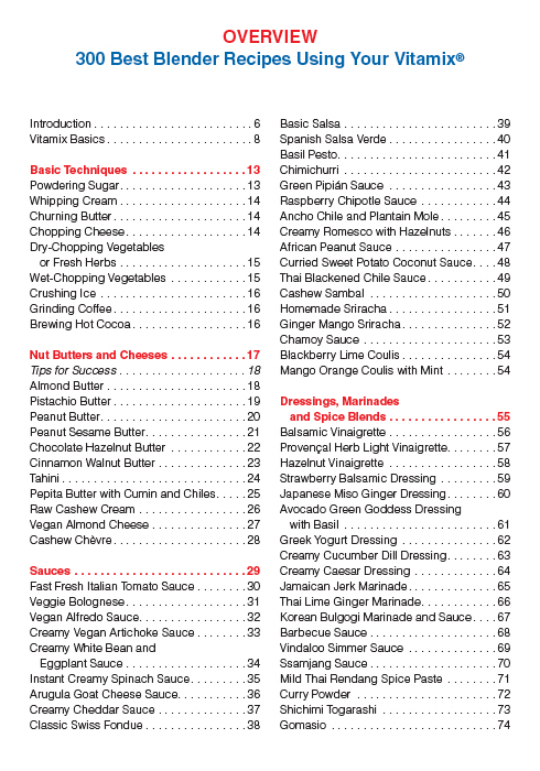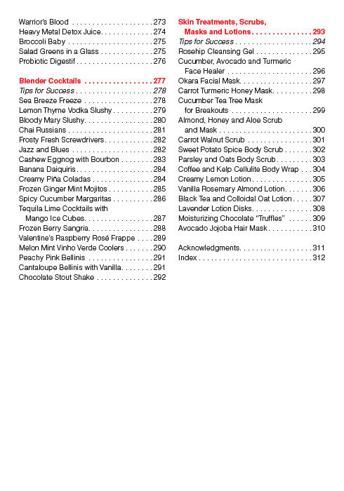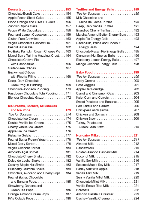 There are 300 mouthwatering recipes divided into sections: Smoothies Smoothie Bowls and Parfaits Juices and Blends Fresh Flours and Baking Baby Food Alternative Milks Sauces Dressings, Marinades, Spice Pastes and Blends Soups Dips and Spreads Burgers and Loaves Desserts Ice Cream, Sorbets, Milkshakes and Popsicles Truffles and Energy Balls Alcoholic Drinks Scrubs, Masks and Lotions.