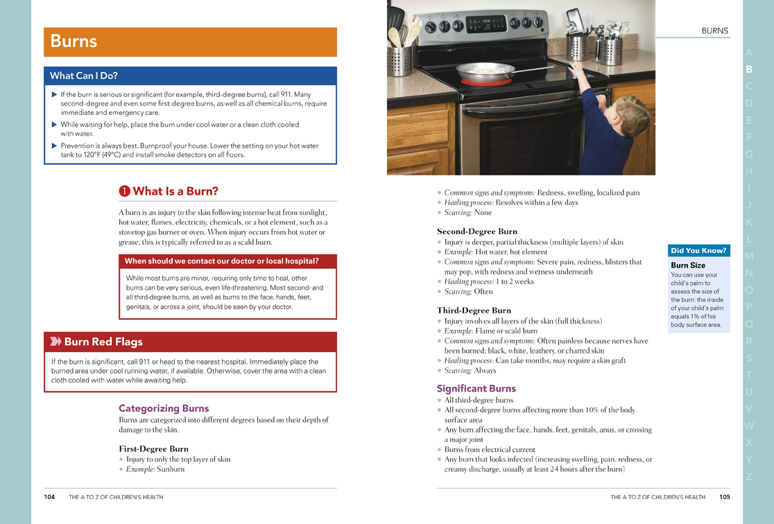 You will find all the valuable information you need to better understand and manage your child’s health concerns. All the illnesses are arranged alphabetically by Condition & Care — making it easy, quick and accessible — for those situations when time really is of the essence. You’ll find expert advice on how to cope with everything from common accidents and emergencies that occur in childhood, to information on the nature of the many conditions that can affect your child.