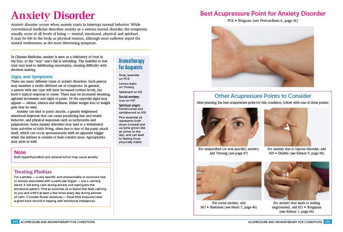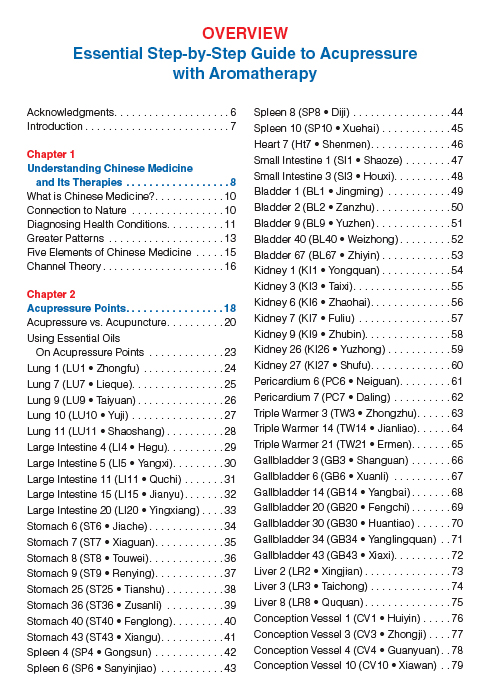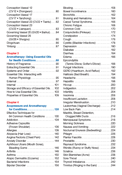 Part 4: Treating Health Problems with Acupressure and Aromatherapy Techniques for treating all the conditions and specific instructions for treating 64 specific common health conditions, such as: toothache, tinnitus, headache, cough, asthma, acid reflux, bloating, hot flashes, morning sickness, eczema, tennis elbow, adrenal fatigue, bladder infections, anxiety and insomnia.