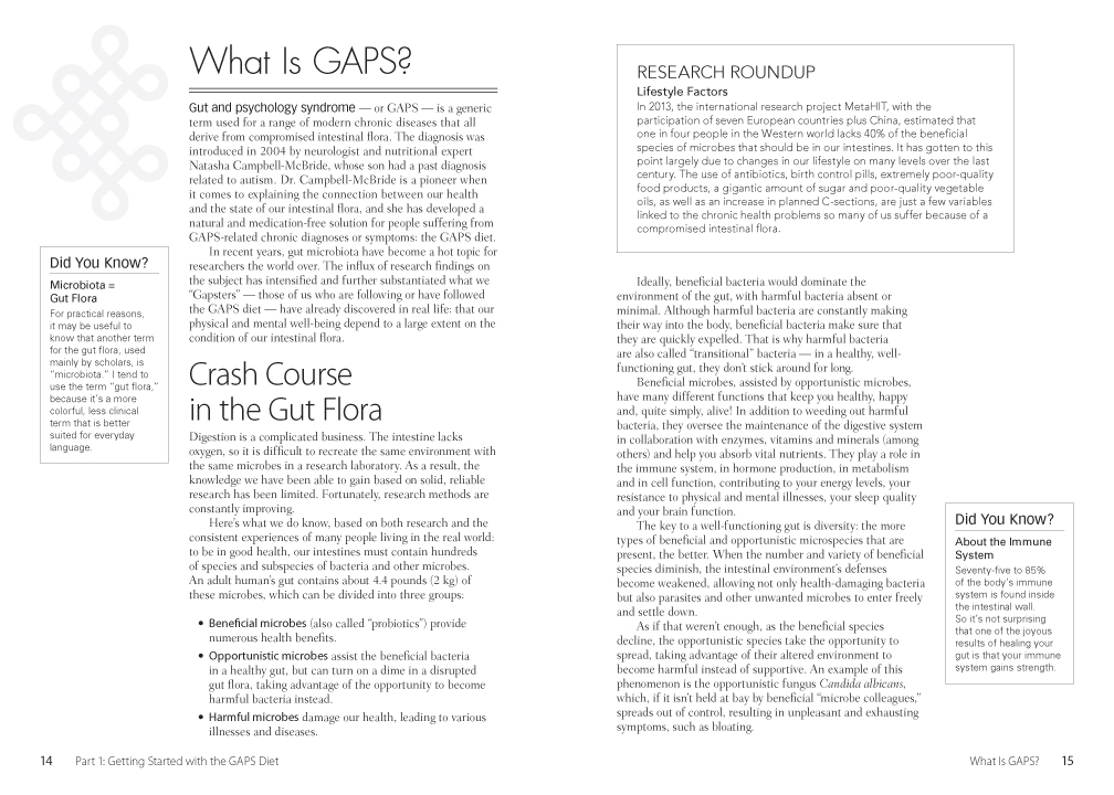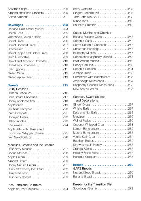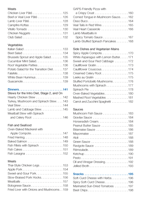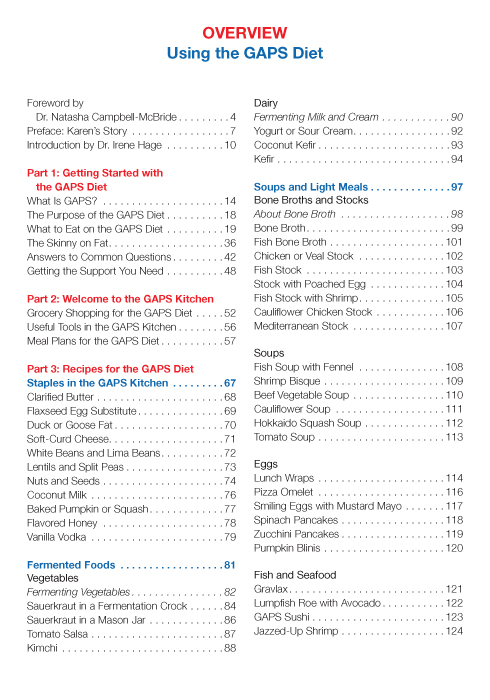 You will find helpful information on the following topics: What is GAPS? The purpose of the GAPS diet Frequently asked questions What to eat Tips for grocery shopping Useful tools for the GAPS kitchen Pantry staples and meal plans 175 delicious recipes