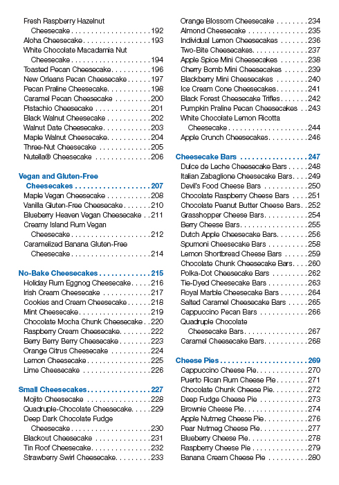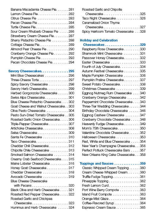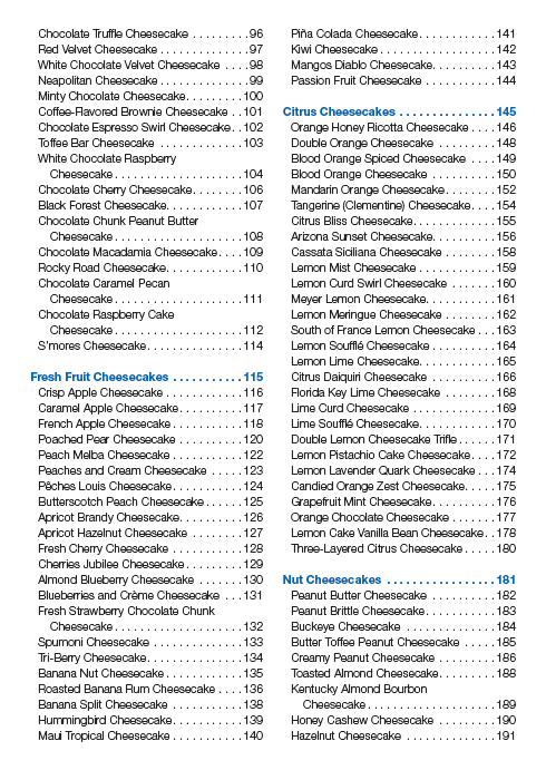 Now, The Cheesecake Bible is back and better than ever with 90 new recipes to satisfy people who eat a gluten-free diet and to answer the recent cultural appetite for more savory cheesecakes. Iconic recipes include Deep Dark Chocolate Fudge Cheesecake and White Chocolate Velvet Cheesecake with Port Wine Berry Compote. Then there are the more savory options, such as Black Olive and Herb Cheesecake and Blue Cheese Cheesecake with Pecans. Other offerings include nut, citrus, no-bake, vegan, fruit, chocolate, cheese and holiday cheesecakes, as well as cheesecake bars, small cheesecakes, toppings and sauces. With more than 300 recipes, there’s a cheesecake for everyone.