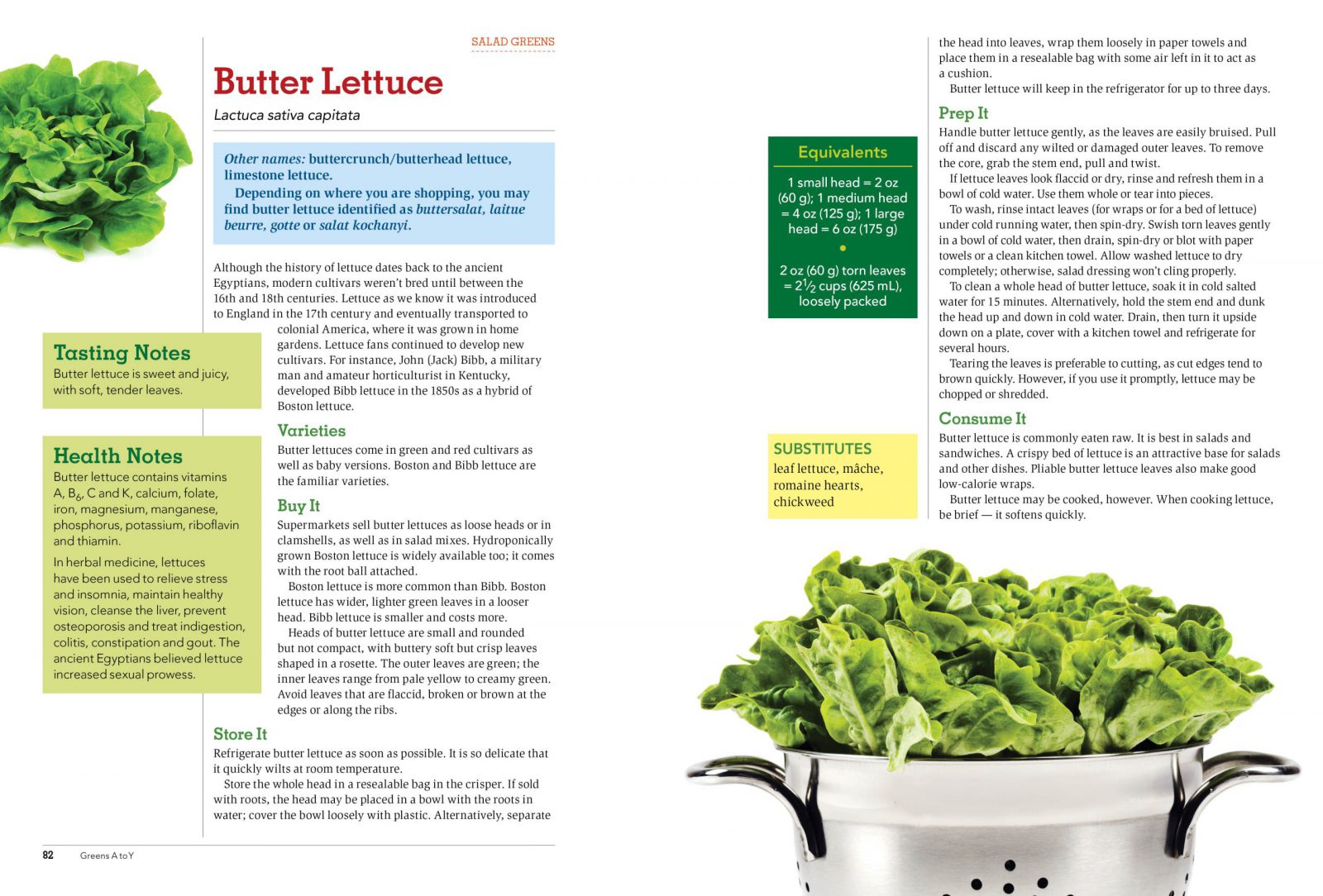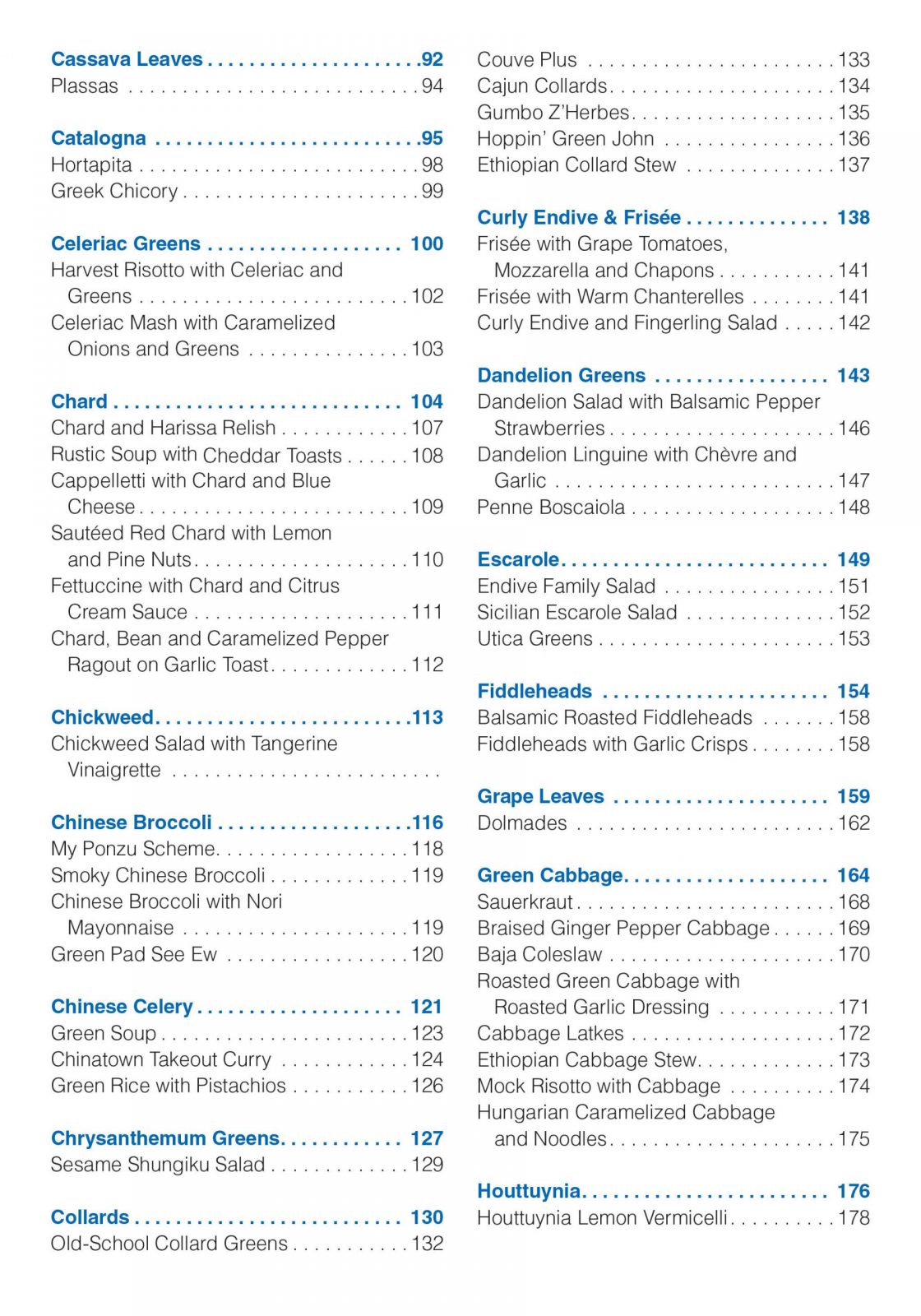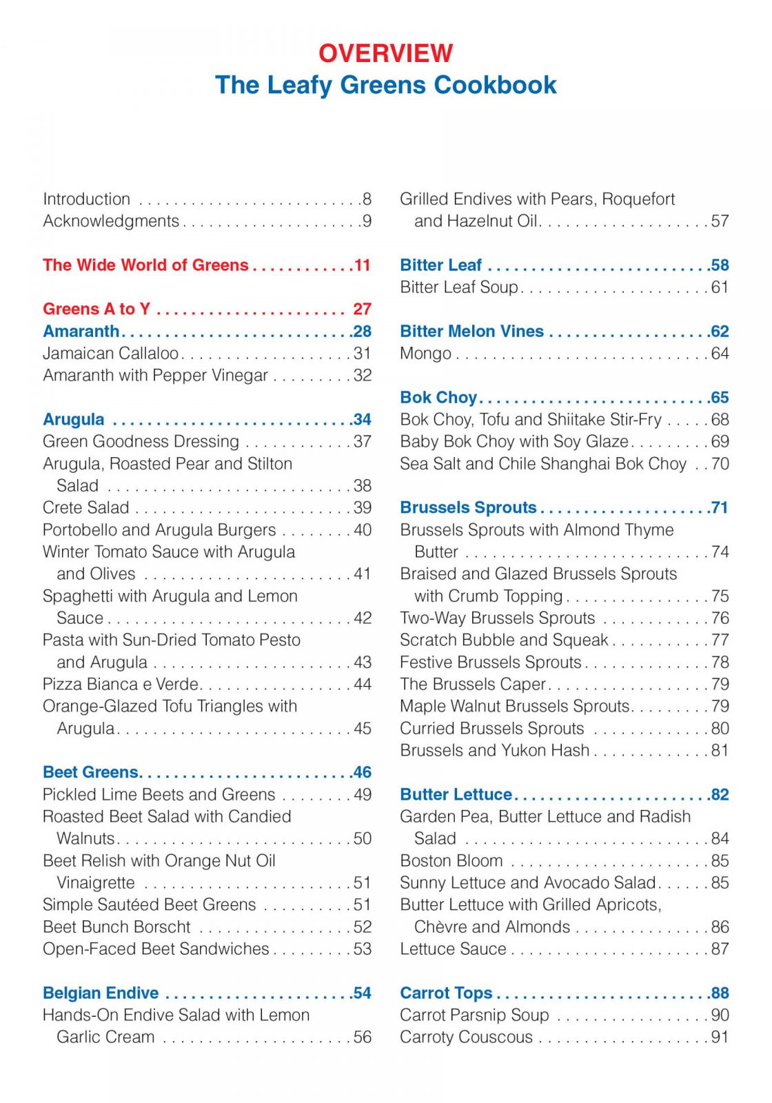All the greens are listed alphabetically, and each listing contains: Scientific and alternate names, and types Historical information including fascinating folk remedies Nutritional information as well as tasting notes Recipes that correspond to the particular green How to buy, store, prepare and cook the green Measures and substitutions, equivalents Intriguing and entertaining sidebar boxes.