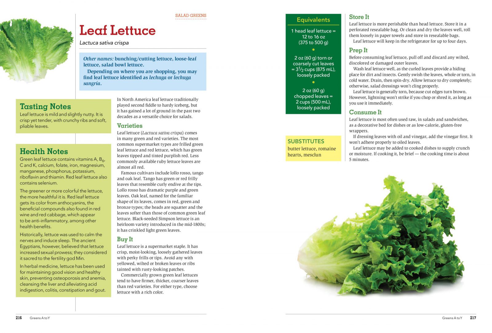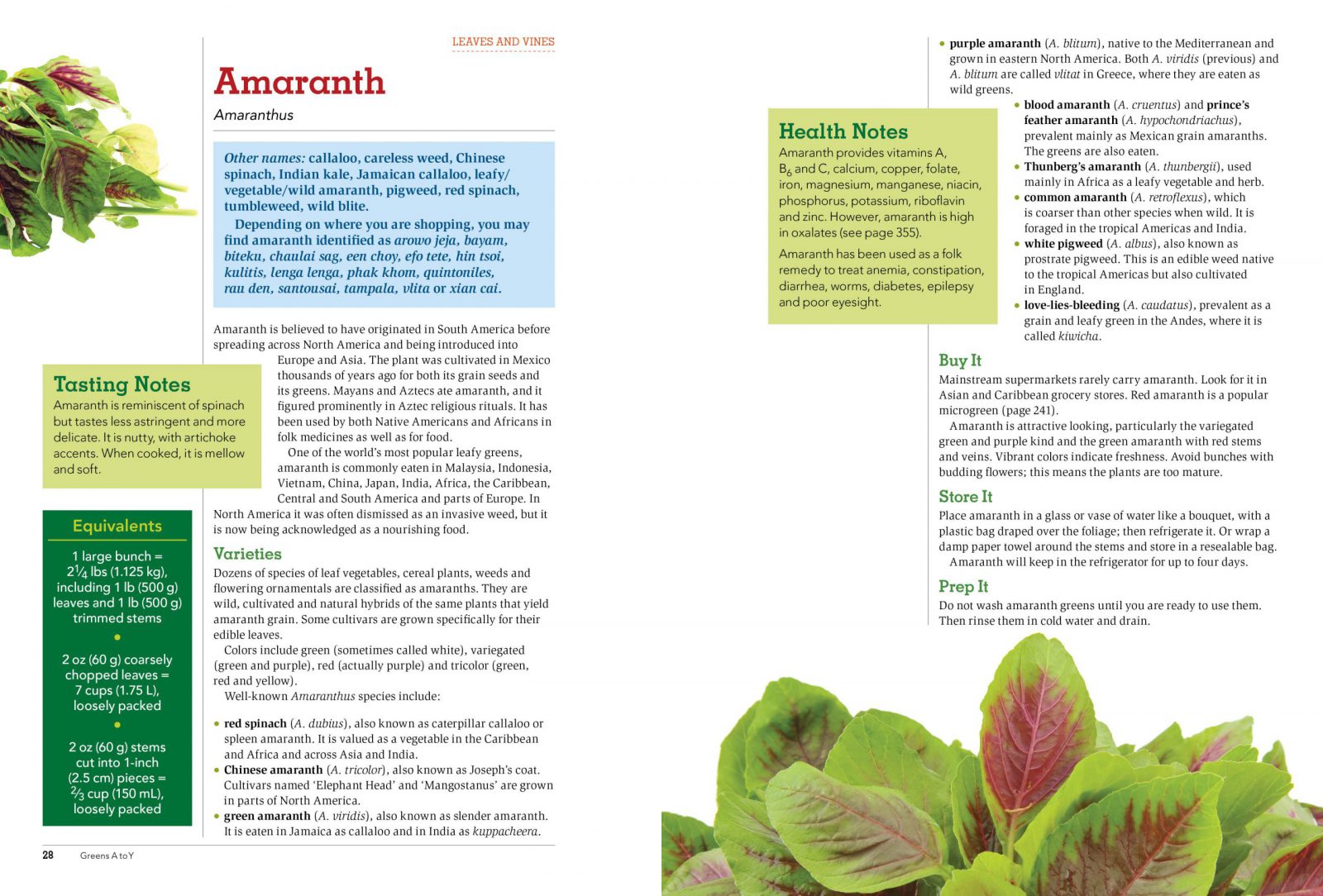 Dozens of varieties of leafy green (67 to be exact) are featured, each with a photograph for easy identification — from popular ones like spinach, to the trendy such as kale and collards, to the obscure like mizuna or purslane, which may only be familiar to foragers, avid gardeners or world travelers. But the world is getting smaller every day and our grocery store selection larger, so it’s probably just a matter of time before you see these at your local grocers.