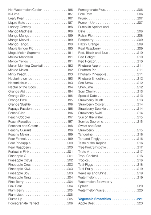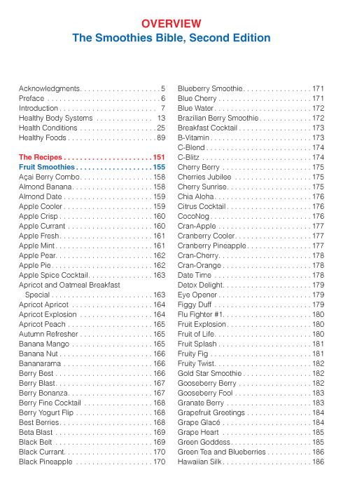 Readers will benefit greatly from Crocker’s description of eight common health concerns along with her recommendations on combating them with natural foods. The Smoothies Bible has been a trusted resource for nearly two decades. This is one of the few books on the subject to cater to intermediate-to-expert smoothie makers with comprehensive information.