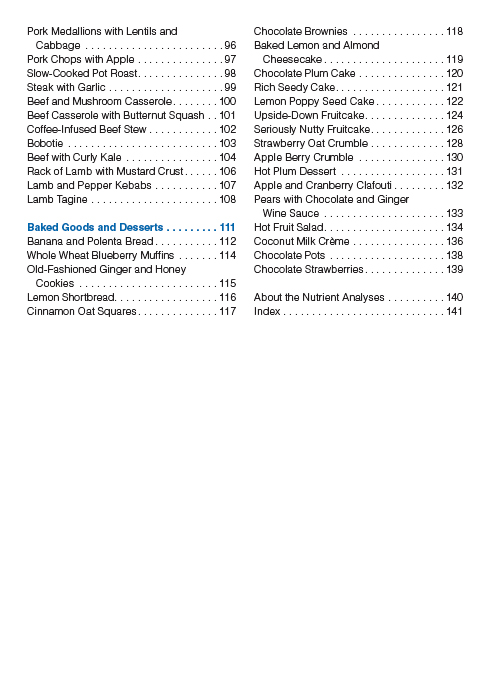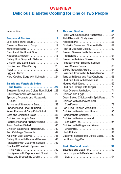 Over 70 recipes for delicious diabetes-suitable meals. Each one of these wonderful recipes, specially created for one or two, is healthy for anyone, diabetic or not. Many are even suitable, with a minimum of adjustment, for those managing other dietary restrictions such as gluten or dairy.