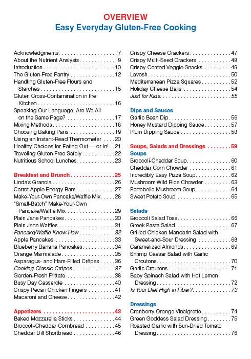 Invaluable information can be found in sections such as The Gluten-Free Pantry, Handling Gluten-Free Flours and Starches, Gluten Cross-Contamination in the Kitchen, Healthy Choices for Eating Out — Or In!, Traveling Gluten-Free Safely and Nutritious School Lunches.