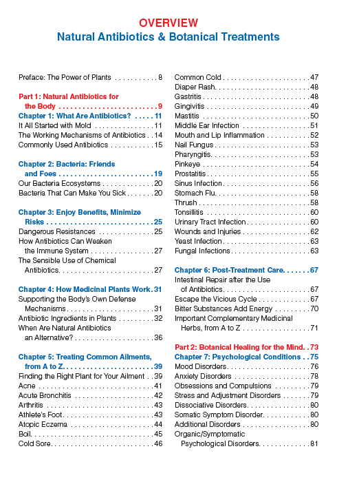 When you feel natural antibiotics are the right choice, you’ll have 46 herbs from the plant kingdom to choose from, along with their medicinal profiles and uses — featuring ingredients like camomile, horseradish, watercress, arnica and thyme. Then over 20 common disorders are listed from A to Z so that you can find just the right herb and dosage for your disorder. Arthritis, sinusitis, bladder infections and tonsilitis can all be treated with natural antibiotics. Natural remedies in the form of botanical pharmaceuticals can also help to alleviate emotional disturbances and they can help you to achieve a sense of balance.