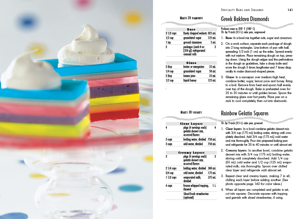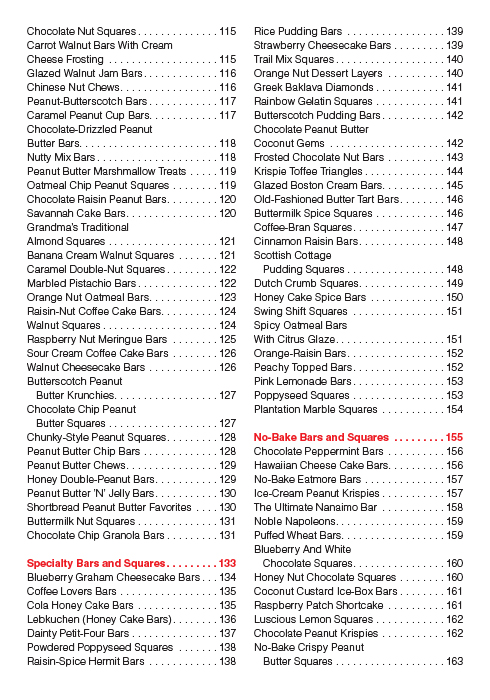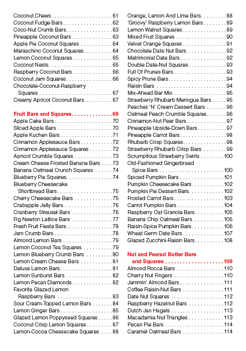 For a snack or after-dinner treat, try Caramel Double Nut Squares or Favorite Glazed Lemon Raspberry Bars. Capture the taste of summer with Rhubarb Crisp Squares or enjoy the classic sweetness of Old-Fashioned Butter Tart Bars. And there’s no better way to enjoy that afternoon cup of coffee or tea than with Banana Cream Walnut Squares, Orange Nut Oatmeal Bars or Raisin-Nut Coffee Cake Bars.