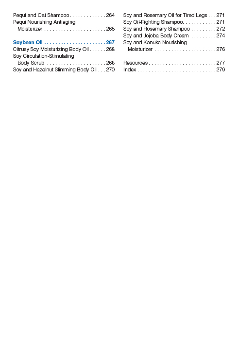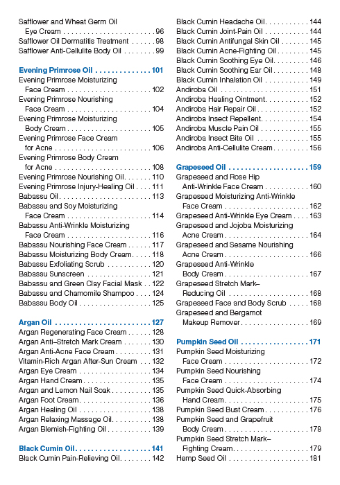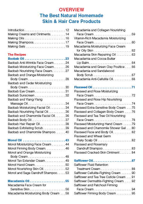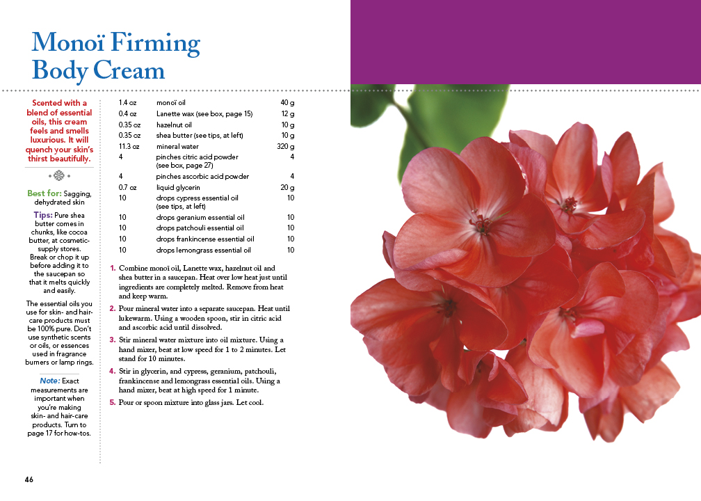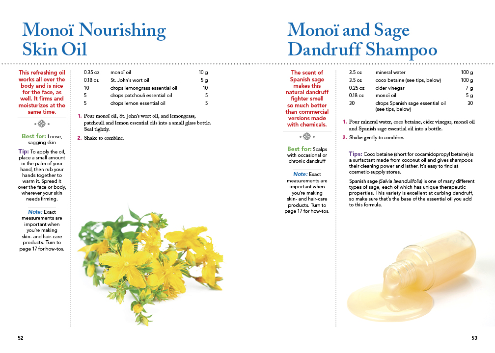 All these oils have wonderful skin-care properties, and there are specific formulas for all sorts of skin conditions, from dry to oily, from acne-prone to wrinkled, from young to old. Each formula is very easy to make and requires only normal kitchen equipment and a good scale. There are formulas for anti-aging creams, firming recipes to fight against cellulite, freckle- and spot-removing oil, moisturizing facial wrinkle cream, anti-dandruff shampoos and many others. Making luxurious, heavenly smelling homemade cosmetics is surprisingly simple and satisfying with this book.