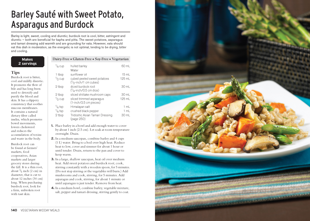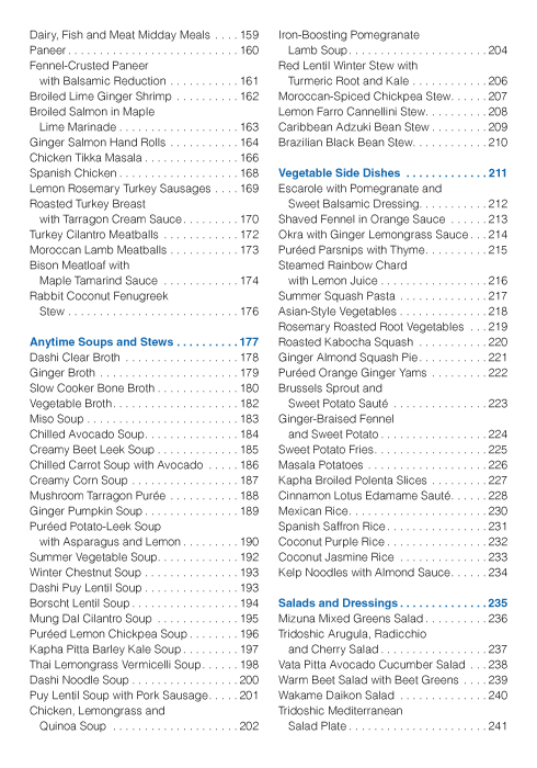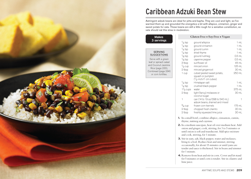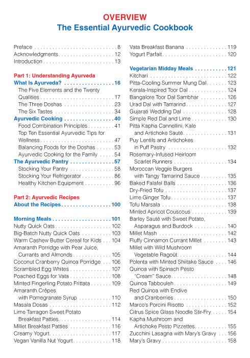 This cookbook addresses wellness, happiness and balance via the time-honored principles of ayurveda, newly interpreted for modern Western culture. Understanding and using these practices provides immediate benefits. All the recipes are selected for the Western palate, and there are recipes containing animal protein for non-vegetarians. Easy to make, tasty bean/lentil recipes are perfect for vegetarians, and, most importantly, dairy-free, gluten-free and soy-free alternatives are provided with most recipes. The recipes are designed to balance all constitutions, which minimizes the guesswork for what recipes are appropriate for each individual. Many of the recipes can be prepared in a variety of ways to accommodate various needs and preferences. Well-organized charts and time-saving tips help prioritize and implement the most important ayurvedic principles in a timeframe that addresses modern busy lifestyles. For anyone looking to improve a regular diet or to experience new ayurvedic practices, this book provides easily understood guidance for a balanced life of wellness without stress.