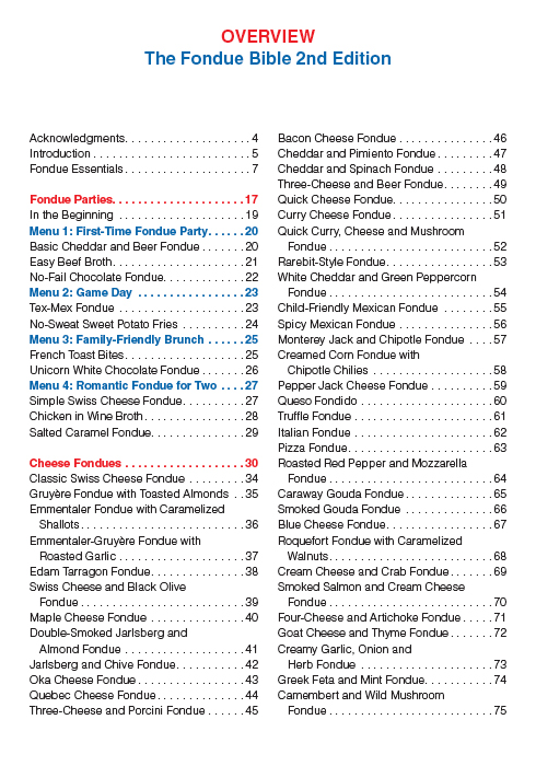 Traditional recipes with a twist include Emmentaler Fondue with Caramelized Shallots and Cheddar Cheese and Beer Fondue, while decadent finishers include Bittersweet Chocolate Fondue and Cherries Jubilee Fondue. With more than 200 recipes, there’s a fondue for everyone. The Fondue Bible also provides menu-planning suggestions, a guide to using and maintaining different types of fondue pots and lots of tips and tricks for fondue cooking. This updated edition offers 10 new recipes in an entire section devoted to throwing fondue parties.