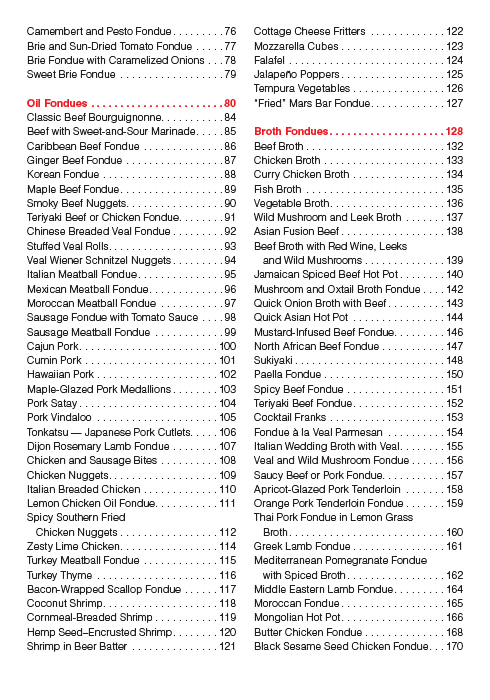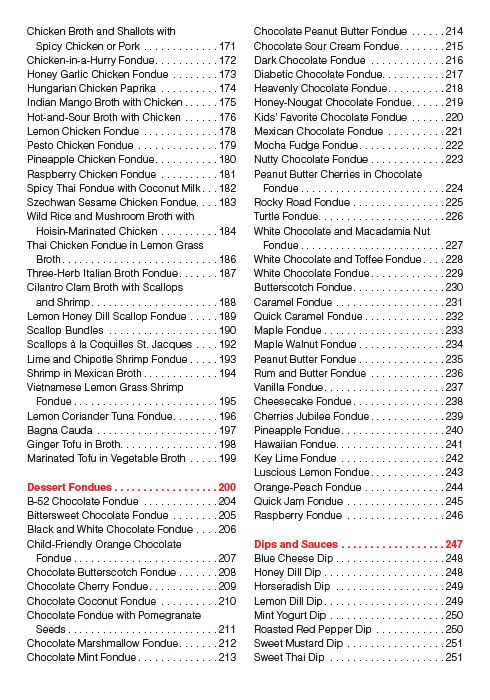 The Fondue Bible has been a market leader and a trusted resource on fondue cooking for over a decade. In addition to traditional favorites and new twists on those classics, it offers a range of recipes that go well beyond the familiar cheese and chocolate varieties, along with dozens of dips and sauces specially designed to complement the recipes. There are hot oil fondues such as Ginger Beef Fondue, Zesty Lime Chicken, and Tempura Vegetables, and savory broth fondues such as Mongolian Hot Pot, Honey Garlic Chicken Fondue, and Thai Pork Fondue in Lemongrass Broth.