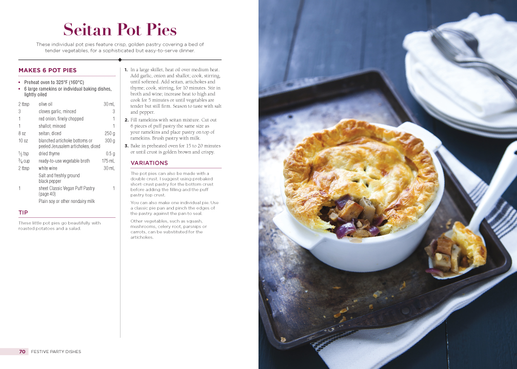 There are substitutes for meat dishes, new versions of glazed logs, chocolates, puffed pastry, cakes, pavlova, Crème Brûlée and even Stollen. And because gluten-free and vegan recipes can get really complicated, Laforêt’s recipes in different categories are easy to adapt. Recipes range from elegant appetizers and hors d’oeuvres (like Cream of Leek Turnovers and Quick Foie Gras–Style Mousse) to stunning festive main courses (such as Roast Vegetable Wellington with Sweet Potato Mousseline, Seitan Pot Pie and Sweet Potato Stuffed with Chestnuts and Smoked Tempeh).
